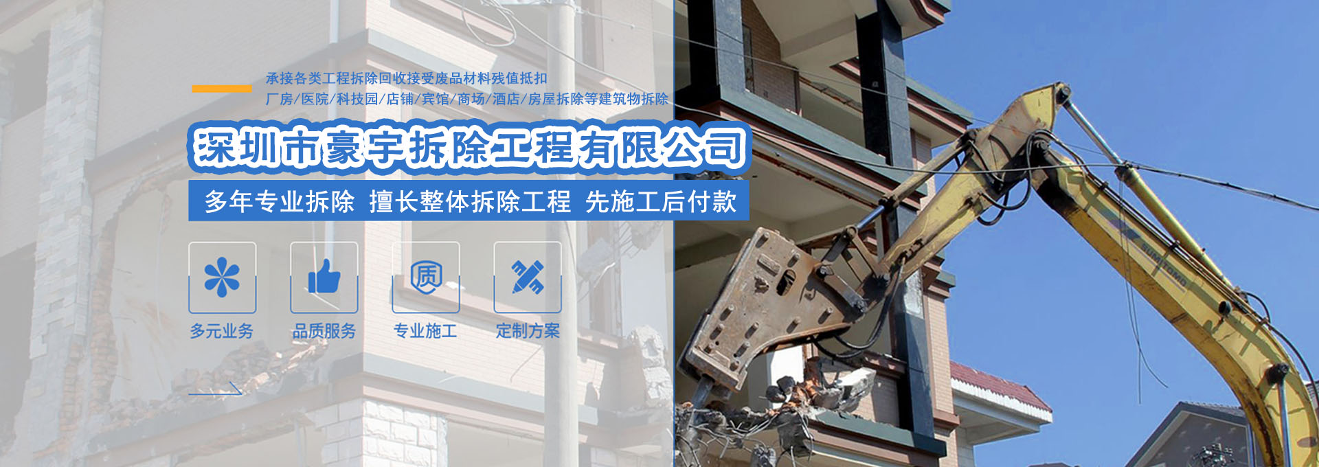 施工设备齐全,队伍服务意识强,为客户创造价值是我们存在的唯一理由。深圳市豪宇拆除工程有限公司是一家实力雄厚、政府注册、具有楼房拆迁资质的正规单位。本公司有着多年专业拆除经验、高低楼房、钢结构厂房、大型酒店KTV、桥梁及高速路的拆除业务。公司以坚持不懈、精益求精、多年如一日致力于专业拆除业务,成功地解决了在拆除过程中遇到的种种困难和难题。以领先的思考、优秀的员工、精湛的技术、科学的管理、先进机械化设备、让客户满意作为本公司生存和发展的经营理念。针对城市发展的需要,公司拥有炮机、挖掘机、铲车、运输机械等多种先进设备。公司凭借多年积累的雄厚技术力量,现拥有专业的工程技术人员。齐全的拆迁设备、完整的安全质量为保证体系......